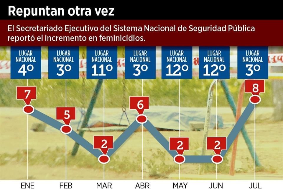 Con ocho feminicidios, Nuevo León registró en julio la cantidad más alta por este delito en lo que va del año, y se ubicó como la tercera entidad del País con mayor número de casos en el mes, según datos del Secretariado Ejecutivo del Sistema Nacional de Seguridad Pública.