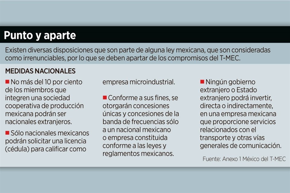 En el Tratado entre México, Estados Unidos y Canadá (T-MEC) se agregaron varios anexos que refieren a las reglas disconformes, es decir, leyes o medidas de las legislaciones locales de cada socio comercial a la que no están dispuestos a renunciar.