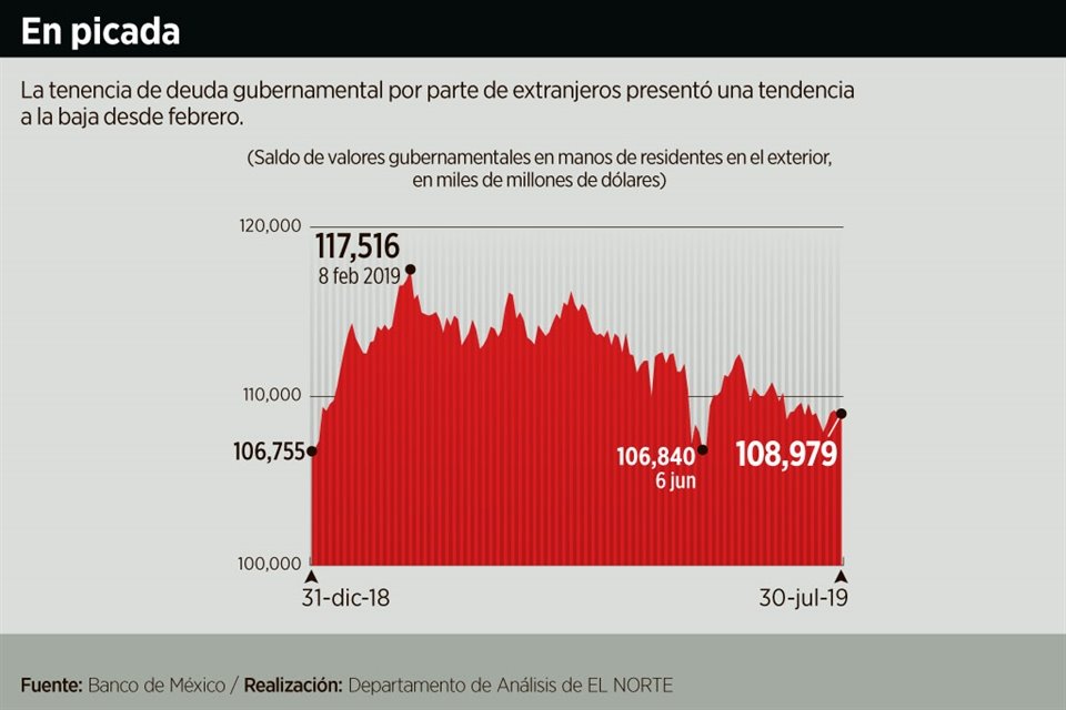 Desde su máximo alcanzado el 8 de febrero pasado hasta el 30 de julio, la tenencia de valores gubernamentales de deuda en poder de residentes en el extranjero cayó en 8 mil 537 millones de dólares.