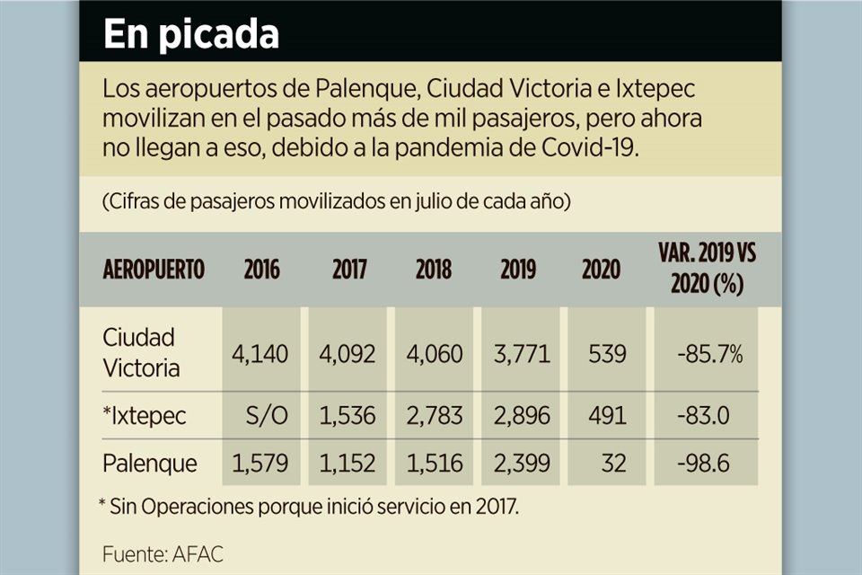 Los aeropuertos de Ixtepec, Palenque y Ciudad Victoria transportaban al mes hasta 3 mil 700 pasajeros, pero por la pandemia, en julio pasado no movieron ni mil viajeros cada uno.