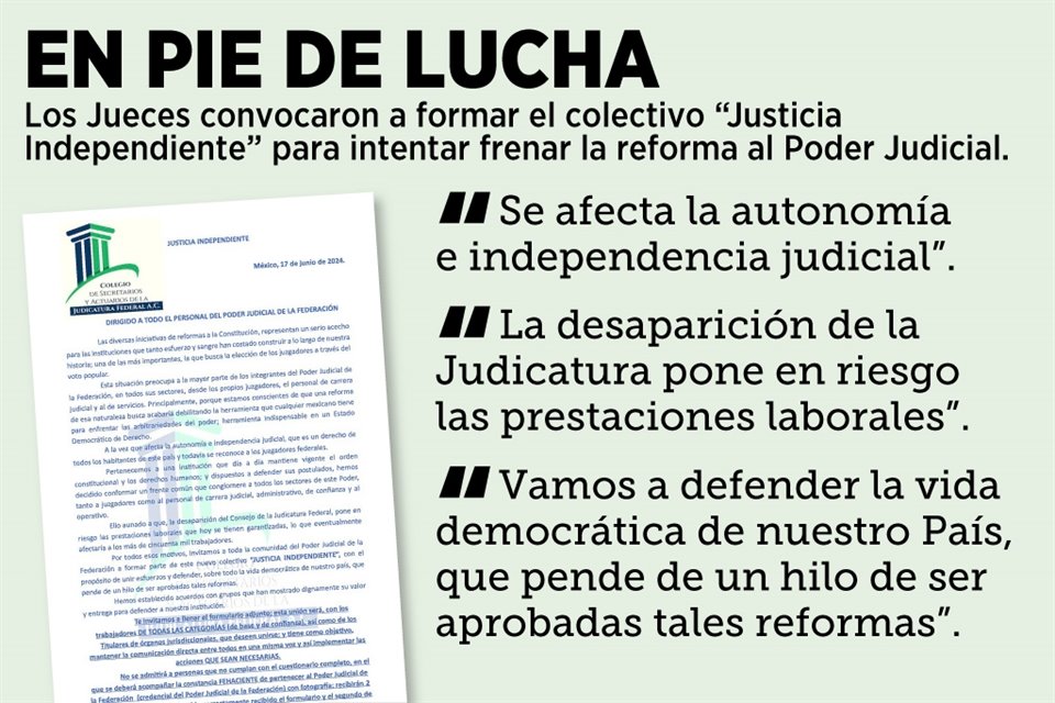 El Colegio de Secretarios y Actuarios de la Judicatura Federal hizo un llamado a todo el personal de los Juzgados de Distrito y Tribunales de Circuito para armar un frente común contra la propuesta de reforma al Poder Judicial.
