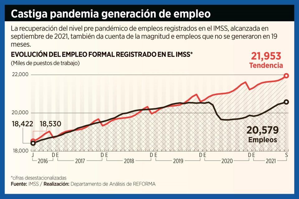 El País perdió 19 meses de creación de trabajos y, con base en la tendencia del mercado laboral nacional en los últimos años, se dejaron de generar 1.4 millones de plazas formales en dicho tiempo en el que la economía tardó en regresar al nivel que tenía el empleo antes de la pandemia.