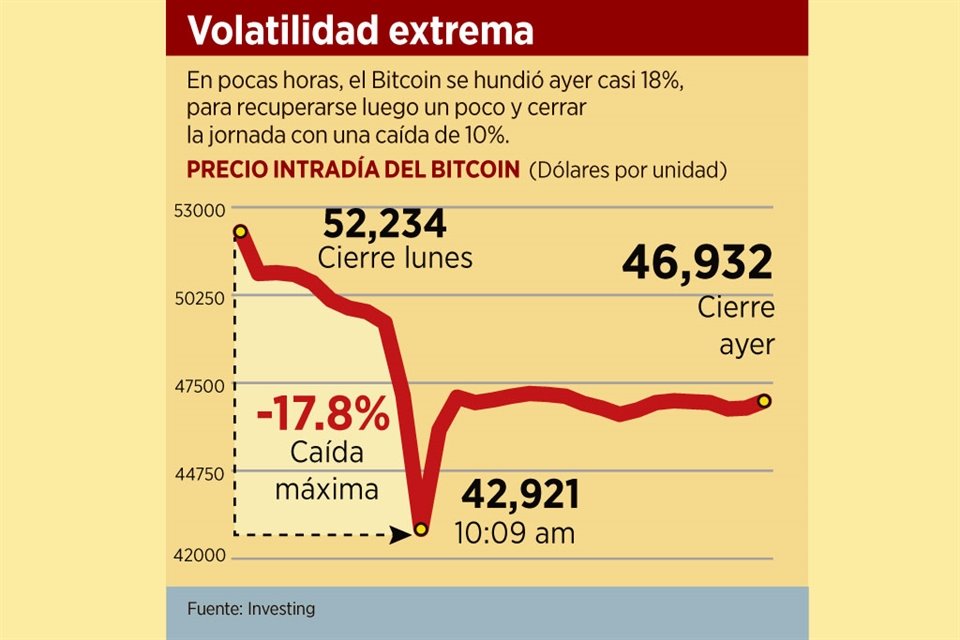 El Bitcoin llegó a caer hasta 17.8 por ciento ayer por la mañana a poco menos de 43 mil dólares, su nivel más bajo en un mes, justo en el día cuando El Salvador lo adoptó como moneda de curso legal.