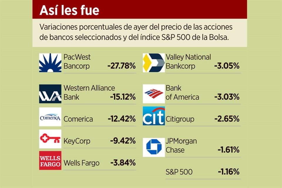 Un día después de que se anunció el rescate de First Republic Bank por parte de JPMorgan Chase, ayer se desplomaron las acciones de más bancos estadounidenses, sobre todo de regionales, pero también de gigantes, ante temores de nuevas quiebras.
