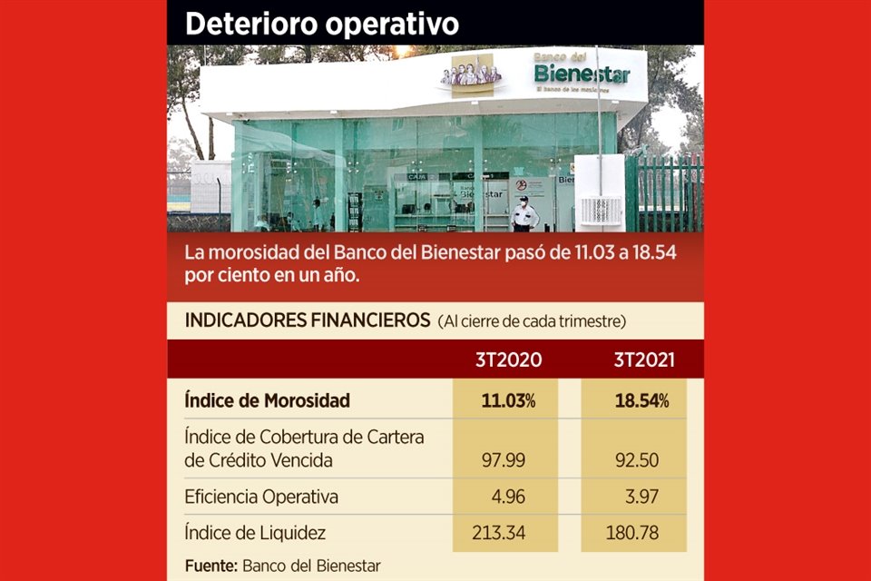La tasa de impago en Banco del Bienestar fue de 18.54 por ciento al cierre del tercer trimestre del año, 7.51 puntos porcentuales más respecto al mismo periodo de 2020.