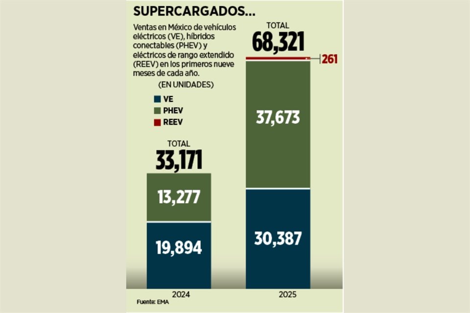 Impulsados principalmente por las marcas chinas, la venta de automóviles eléctricos e híbridos conectables subió de enero a septiembre 106% en México, con relación al mismo periodo de 2024, al pasar de 33 mil 171 a 68 mil 321 unidades, de acuerdo con el Barómetro de Electro Movilidad Asociación (EMA).