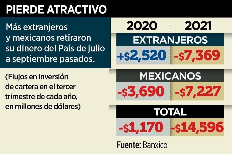 Durante el tercer trimestre del año, la inversión de cartera mostró una fuga de capitales, tanto de extranjeros como de mexicanos, de 14 mil 596.3 millones de dólares, mil 147 por ciento más que los mil 170.1 millones del mismo periodo del 2020.
