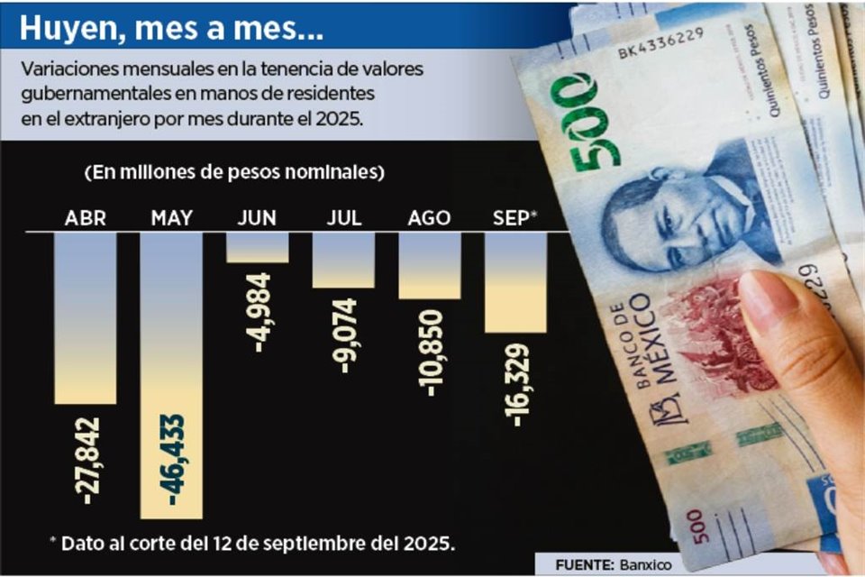 En los últimos cinco meses y medio, hasta el 12 de septiembre, los residentes en el extranjero se deshicieron de 115 mil 512.9 millones de pesos en valores gubernamentales en términos netos, muestran datos del Banco de México (Banxico) de acuerdo al saldo de sus posesiones.