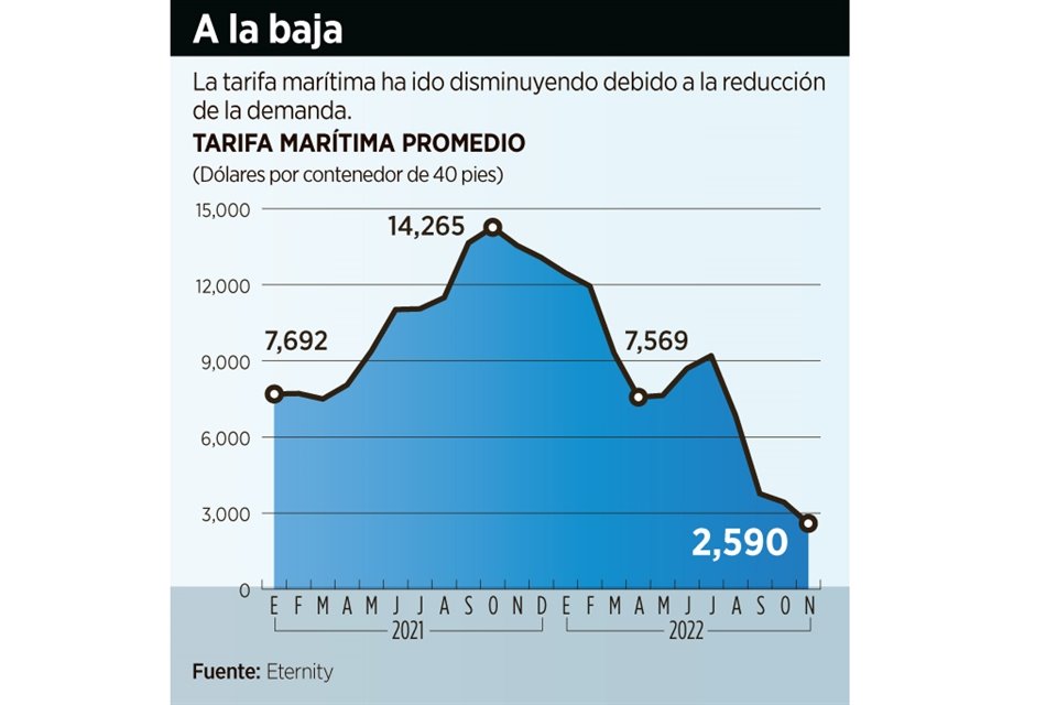 La tarifa marítima en la ruta comercial China-México tuvo su nivel más bajo en noviembre pasado, al cotizar en 2 mil 590 dólares por contenedor de 40 pies, según el índice EAX, de Eternity Group.