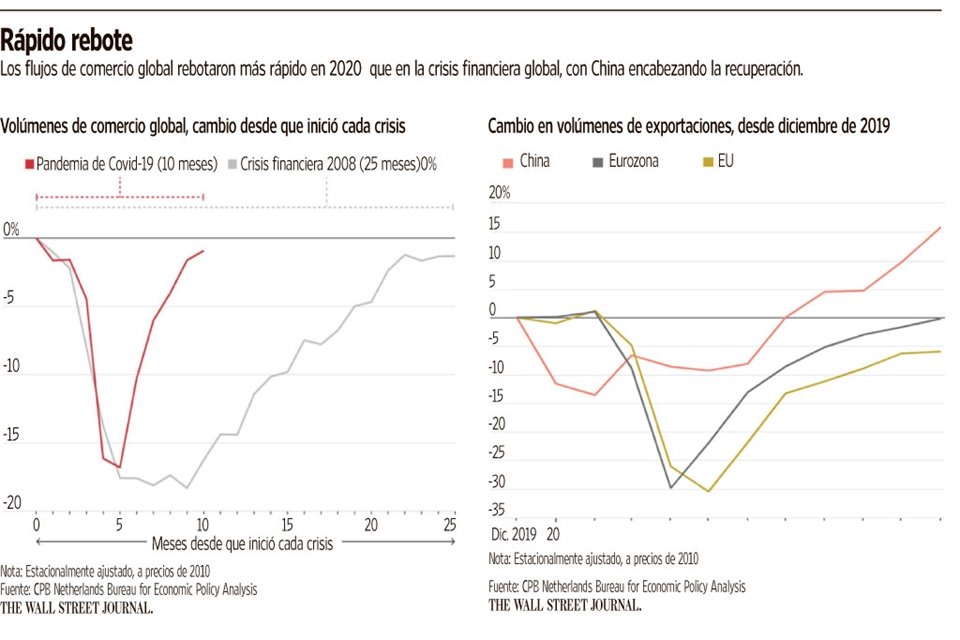 El comercio global se ha recuperado de su colapso en las etapas iniciales de la pandemia, y China y otros países manufactureros asiáticos se están quedando con una rebanada más grande del pastel de las exportaciones de todo, desde cubrebocas hasta bicicletas -una participación de mercado- que se anticipa que conserven después de que la crisis de salud pública se disipe.