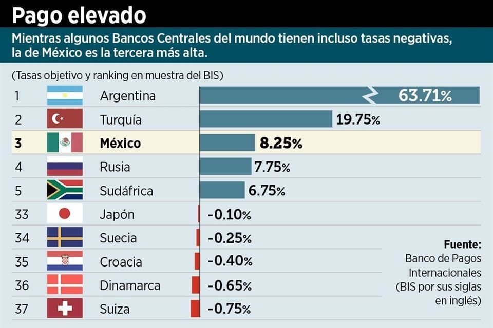 De una muestra de 37 bancos centrales de países independientes, más el de la Unión Europea, de 28 miembros, que sigue el Banco de Pagos Internacionales (BIS, por sus siglas en inglés), el Banxico tiene la tercera tasa de interés nominal más alta en el mundo.