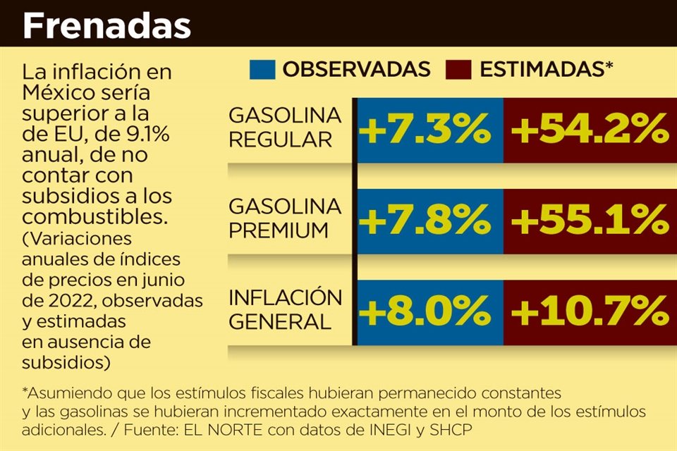 De no ser por los estímulos fiscales a las gasolinas, también llamados subsidios, la inflación en México se habría ubicado en por lo menos 10.74 por ciento anual en junio, 2.75 puntos porcentuales más que el nivel reportado, de acuerdo con cálculos de Grupo REFORMA.