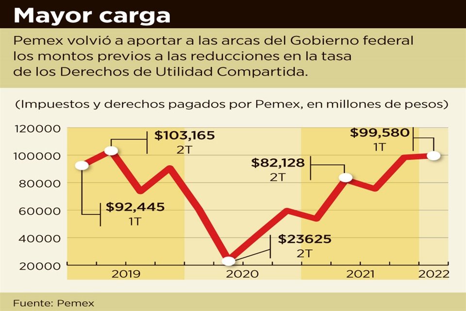 Durante el primer trimestre del presente año, Pemex pagó al Gobierno federal por impuestos y derechos 85.6 por ciento más que en el mismo periodo del 2021 y el equivalente a 2.19 veces lo que el Gobierno inyectó a la petrolera para el pago de deuda.
