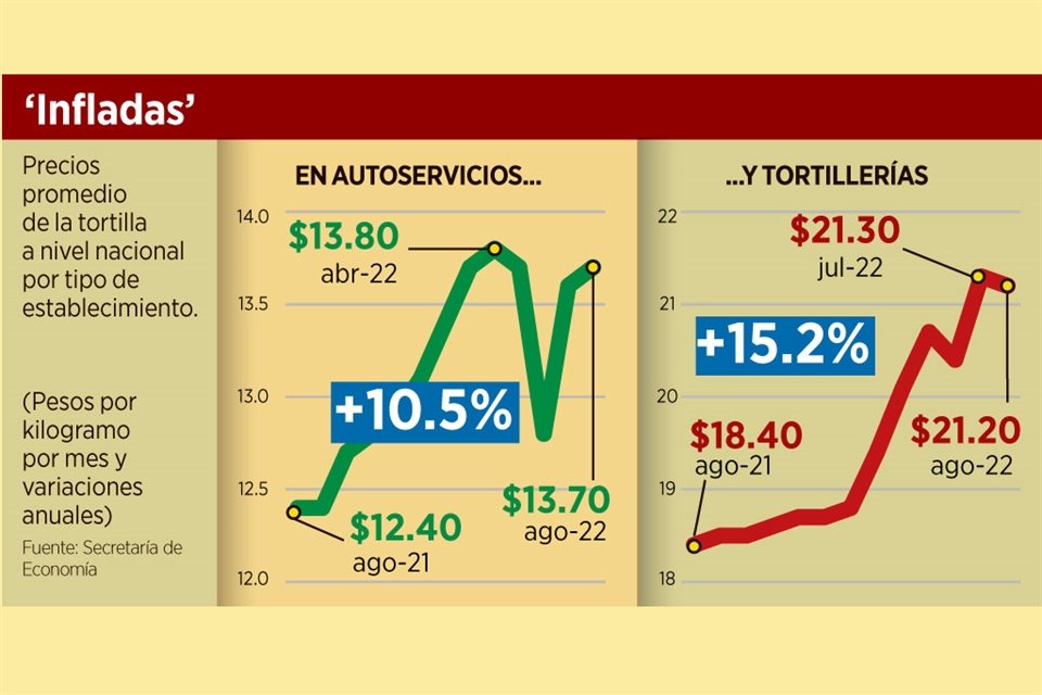 En agosto pasado, el precio promedio de la tortilla de maíz en el País sumó otro aumento, pero su magnitud no corresponde al encarecimiento de la harina con la que se elabora, sino a otros insumos y factores que se le sumaron, muestra un análisis de Grupo Consultor de Mercados Agrícolas (GCMA).