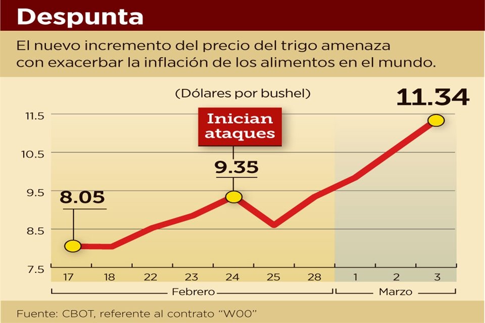 Impulsado por la extensión de la guerra de Rusia y Ucrania, el precio del trigo subió ayer otro 7.1 por ciento, a 11.34 dólares por bushel (27.22 kilogramos), acumulando con ello un alza de 28.2 por ciento desde que estalló el conflicto, el pasado 24 de febrero.
