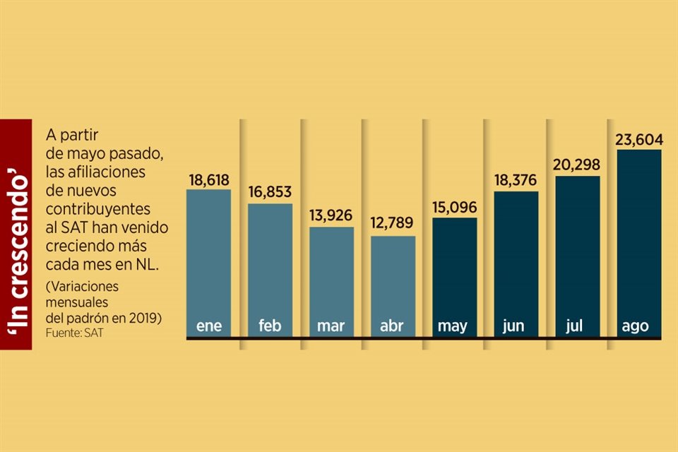 El número de nuevos contribuyentes en Nuevo León aumentó en agosto 22.5 por ciento en su comparación anual, de acuerdo con información del Servicio de Administración Tributaria (SAT).