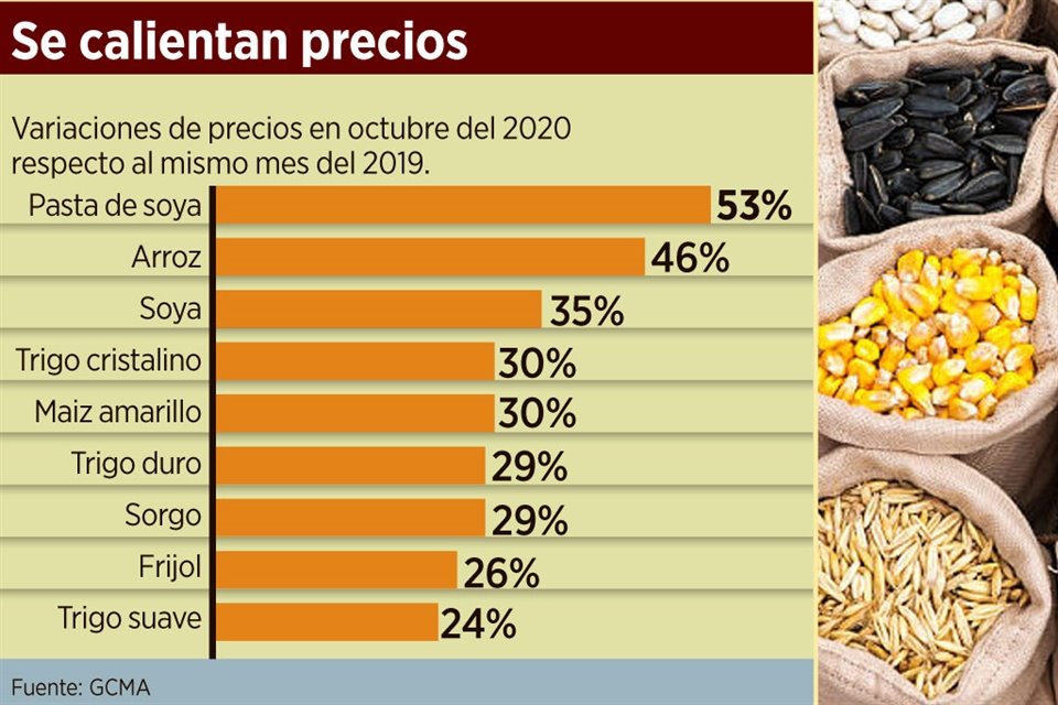Con una menor producción nacional y ahora mayores importaciones caras provocadas principalmente por el crecimiento de China, los precios de los granos básicos en México mostraron en octubre pasado un alza promedio de 35 por ciento, respecto a un año atrás.