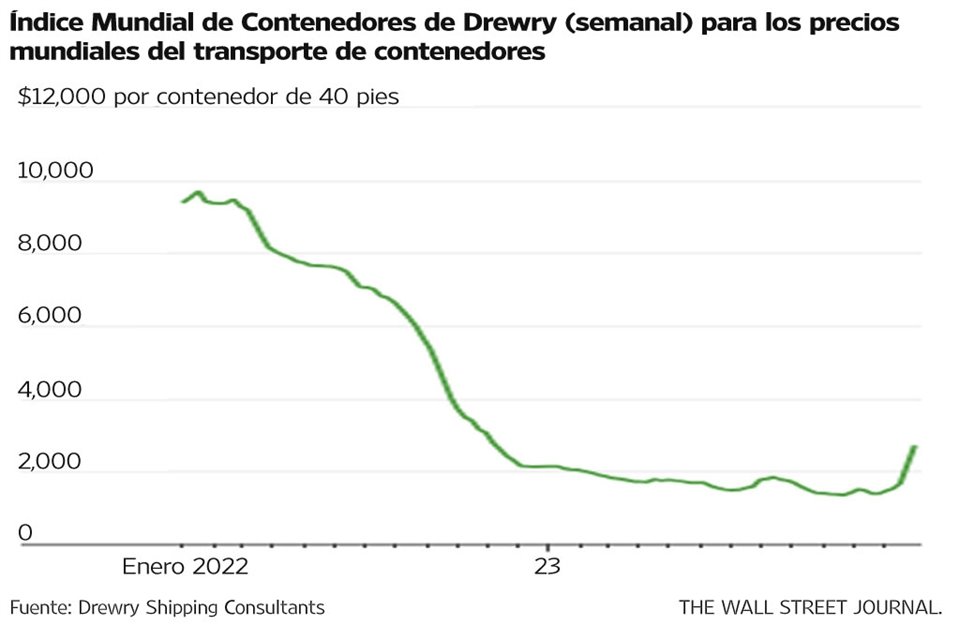 Los importadores occidentales están reportando un marcado aumento en las tarifas de los envíos marítimos y de retrasos de semanas a medida que los transportistas desvían buques del Mar Rojo para evitar los ataques de los rebeldes hutíes.