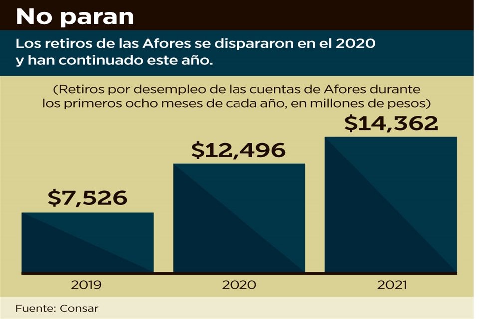 Durante los primeros ocho meses del 2021, los retiros parciales por desempleo que hicieron los trabajadores de su Afore ascendieron a 14 mil 362 millones de pesos, un 14.9 por ciento más que en el periodo comparable del 2020.