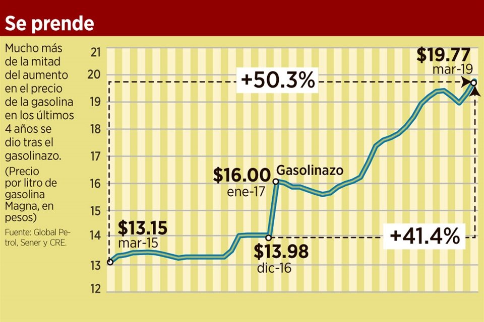 El precio promedio de venta al consumidor las gasolinas Magna y Premium, así como del diesel, se han incrementado en promedio 50 por ciento en cuatro años.