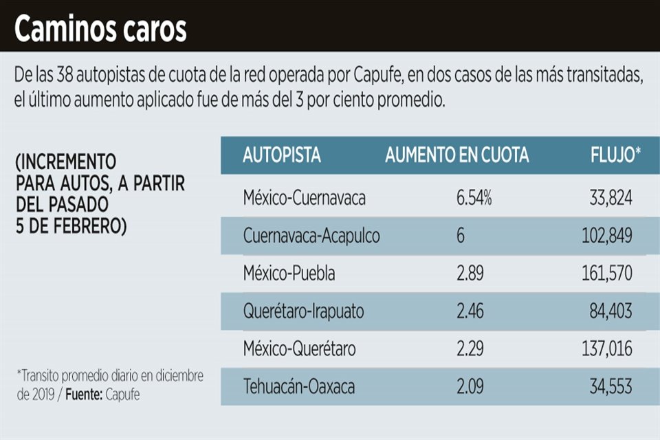 El aumento aplicado a las tarifas de las carreteras de cuota operadas por Capufe en promedio fue de 3 por ciento, en línea con la inflación, sin embargo en algunos casos, el alza fue mayor, sobre todo en algunas casetas de las carreteras de mayor flujo de automóviles.