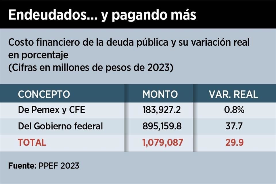 El próximo año, se requerirá un billón 79 mil millones de pesos para cubrir el costo financiero de la deuda del sector público, un incremento real de 29.9 por ciento comparado con el Presupuesto de 2022.
