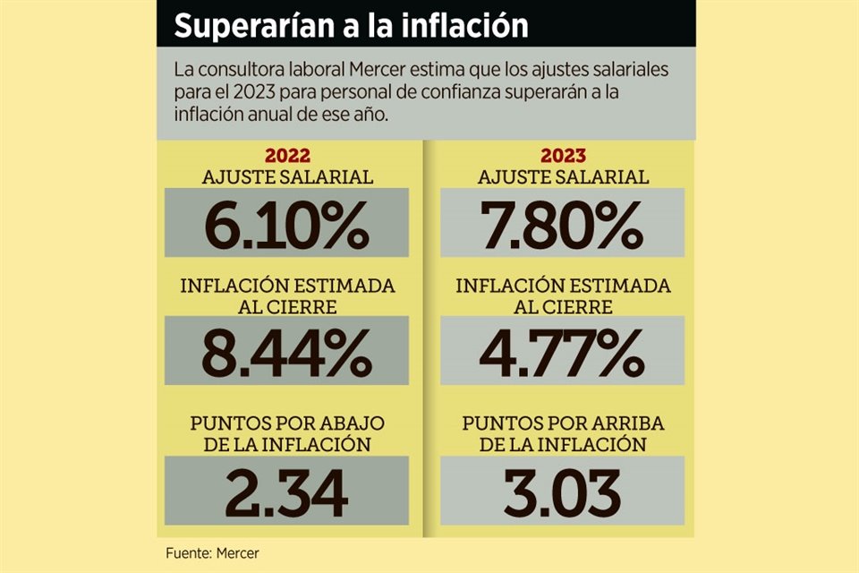 Los salarios para el personal de confianza (no sindicalizado) aumentarán 7.8 por ciento en promedio para el 2023, afirmó Claudia Rodríguez, líder de productos de información del área de Career (carrera) en la empresa de consultoría laboral Mercer.