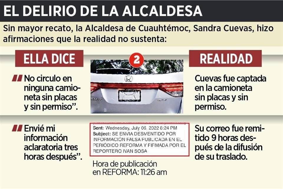 Para intentar justificar el uso de una camioneta sin placas y sin documentación autorizada, la Alcaldesa de Cuauhtémoc, Sandra Cuevas, ha presentado dos permisos, uno apócrifo y otro vencido, además de un pago de placas hecho en el Estado de México.