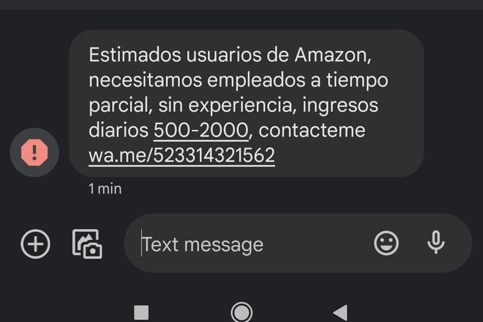 "Estimados usuarios de Amazon, necesitamos empleados a tiempo parcial, sin experiencia, ingresos diarios 500-2000, contáctenme", indica un mensaje de texto con un link corto a WhatsApp enviado a los teléfonos.