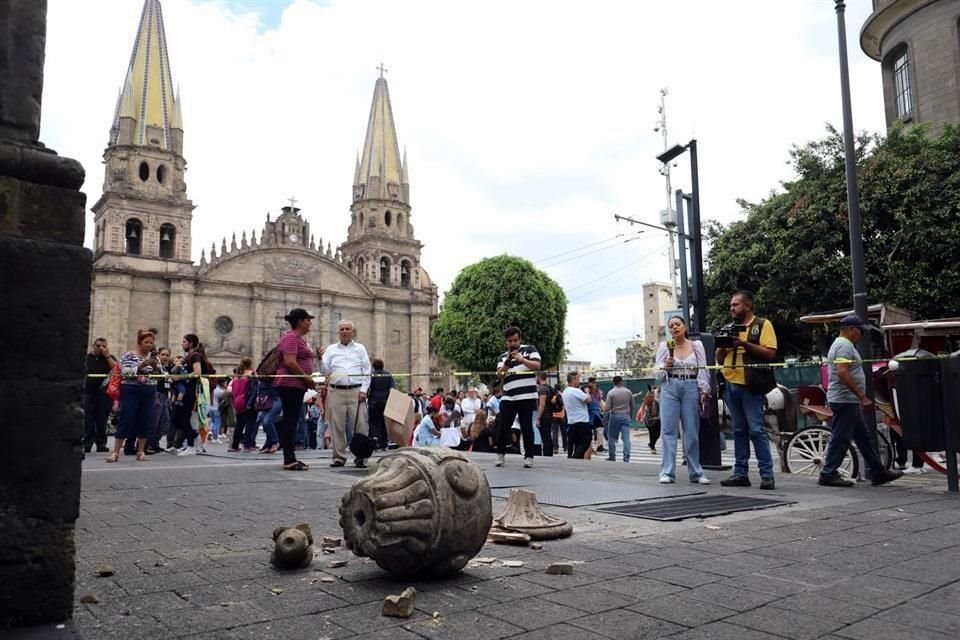 Tras el sismo de magnitud 6.8 cayó una piedra del Templo de San Agustín, en Degollado y Morelos, zona Centro de Guadalajara. Crédito: Ismael Ramírez