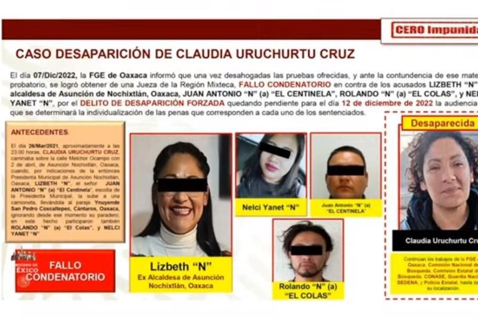 La Secretaría de Seguridad y Protección Ciudadana (SSPC) advirtió que la jueza que declaró culpable a la ex Alcaldesa del Municipio oaxaqueño de Nochixtlán, Lizbeth Huerta, por la desaparición forzada de la activista Claudia Uruchurtu, pidió al Ministerio Público cambiar la acusación en contra de la ex Presidenta municipal, con lo que podría quedar reducida su sentencia.