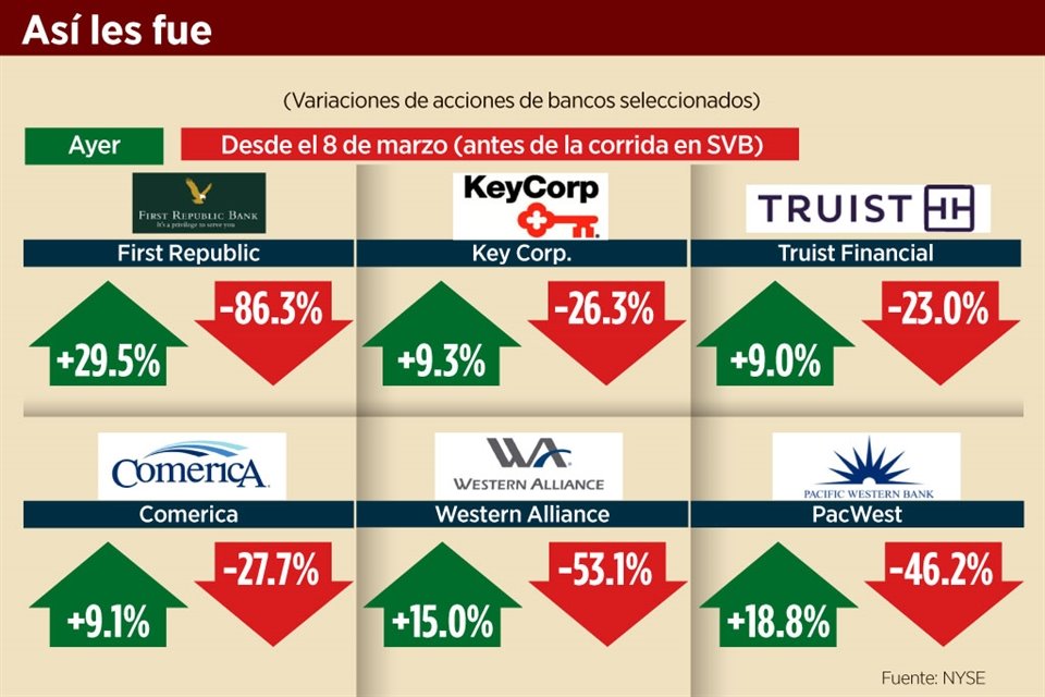 Ayer, tras avances para rescatar al sistema y luego de que la Secretaria del Tesoro de EU, Janet Yellen, declaró que el Gobierno podría intervenir para proteger a los depositantes en bancos adicionales a los ya quebrados, SVB y Signature, las acciones de bancos regionales saltaron, aunque aún están muy por debajo de cuando empezaron los retiros masivos.