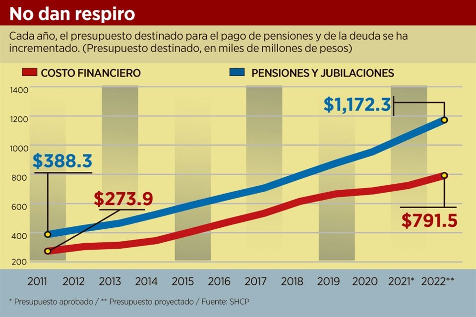 Entre pensiones, jubilaciones, intereses y comisiones por deuda, el Gobierno pagará un billón 964 mil millones de pesos, 27.7 por ciento del total del presupuesto del próximo año.