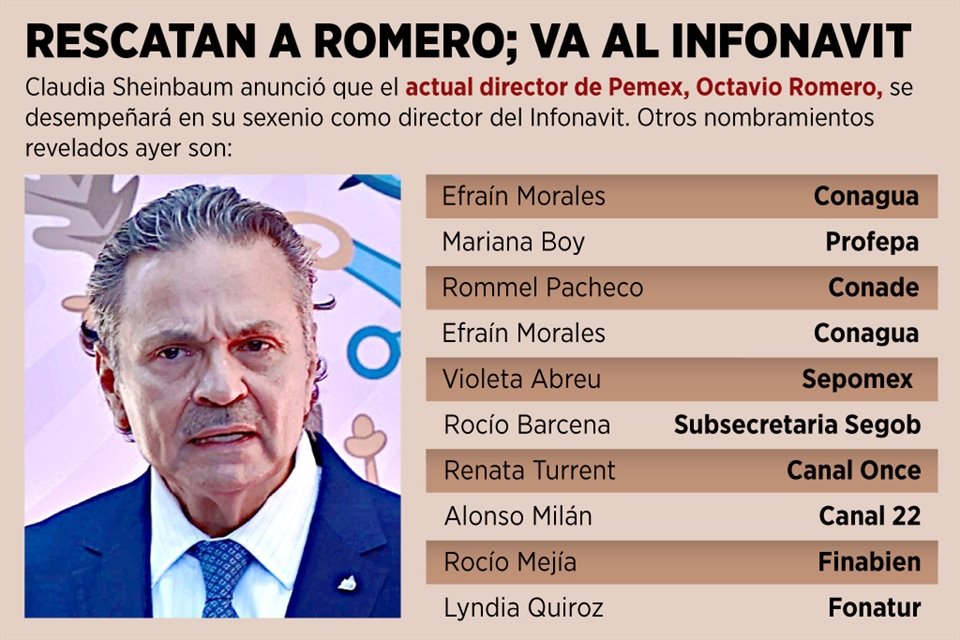 La Presidenta electa de México, Claudia Sheinbaum Pardo, anunció una serie de nombramientos clave para su próxima Administración, destacando la designación de Octavio Romero Oropeza como director general del Instituto del Fondo Nacional de la Vivienda para los Trabajadores (INFONAVIT), Efraín Morales López al frente de la Dirección General de la Comisión Nacional del Agua (CONAGUA), y Mariana Boy Tamborrell como titular de la Procuraduría Federal de Protección al Ambiente (Profepa).