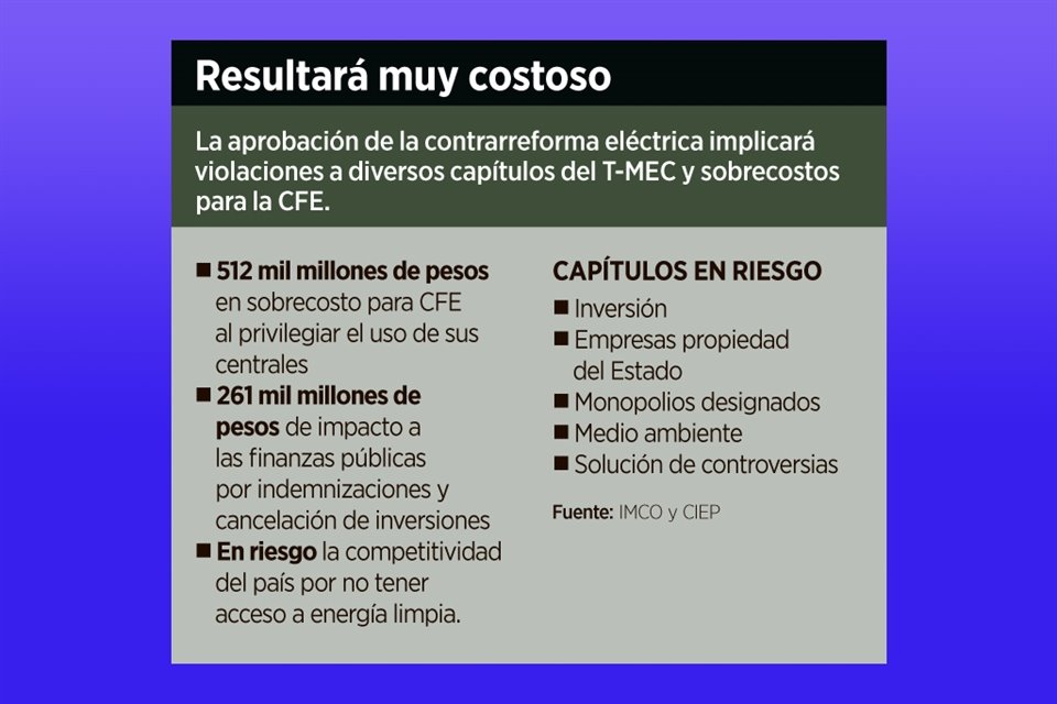 De aprobarse la contrarreforma que pretende dar el control total del sector eléctrico a la Comisión Federal de Electricidad (CFE) se estarían violando disposiciones establecidas en el Tratado Comercial México, Estados Unidos y Canadá (T-MEC).