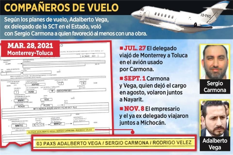 En la lista de morenistas que compartieron vuelos privados con Sergio Carmona Angulo, empresario ligado al huachicol y señalado por financiar campañas de Morena, también figura José Adalberto Vega Regalado, ex titular del Centro SCT en Nuevo León.