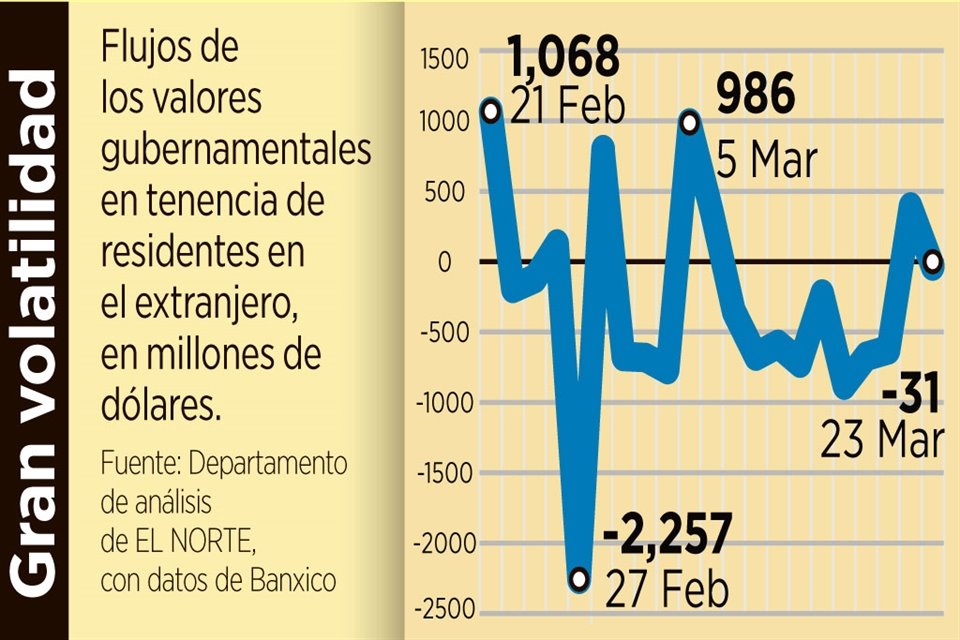 Las expectativas de una recesión global ocasionada por el coronavirus, el desplome de los precios del petróleo y la depreciación del Peso han impulsado a los residentes en el extranjero a deshacerse de parte de sus papeles de deuda pública federal.